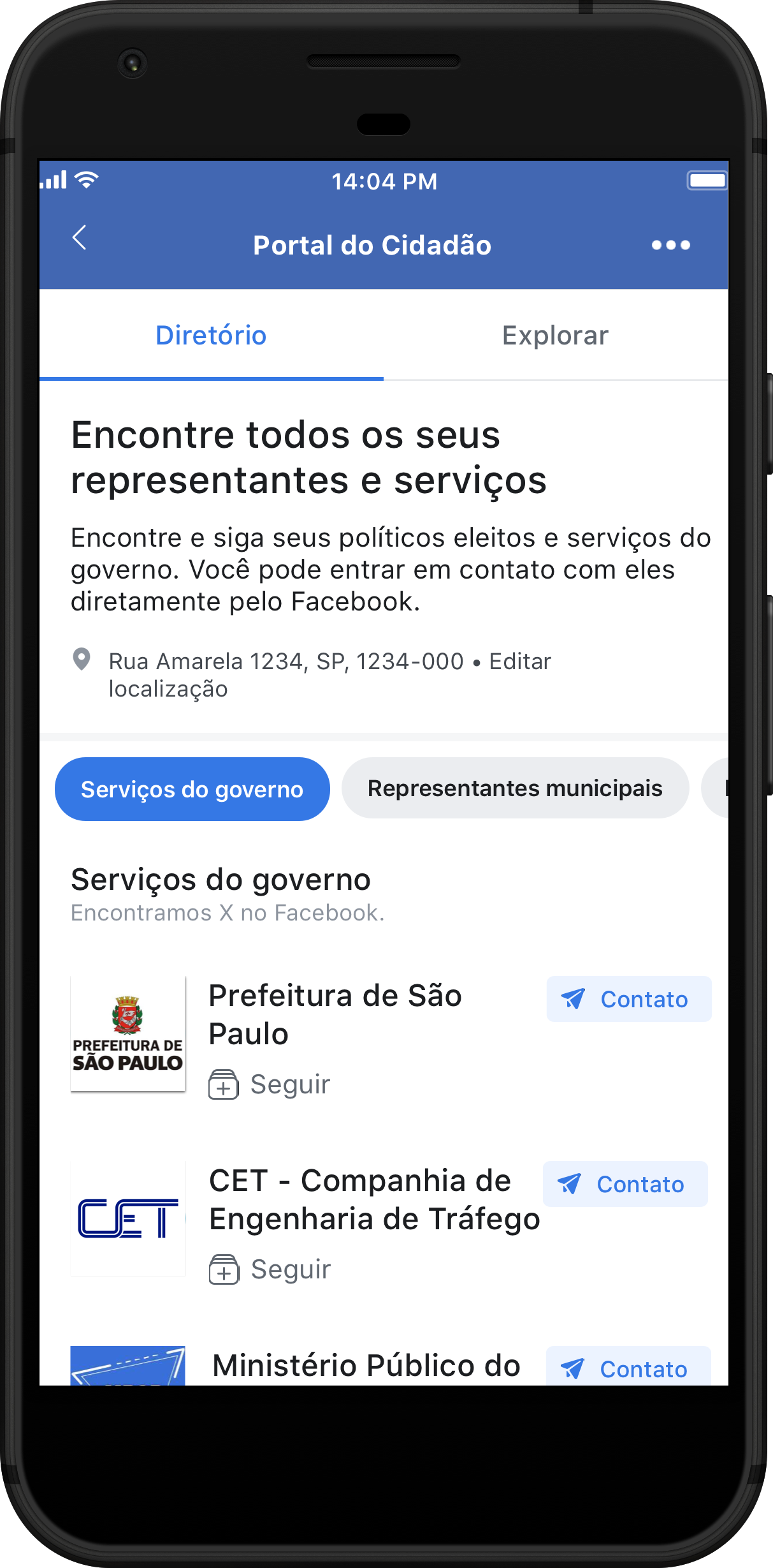 É possível acessar o recurso por meio do Menu do Facebook. Se os usuários escolherem “entrar em contato” com um determinado representante ou agência, eles verão os meios de contato listados pela Página oficial, incluindo a possibilidade de enviar uma mensagem diretamente pelo Facebook.