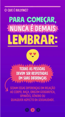 “Considerando que adolescentes e jovens são socializados em ambientes sem fronteiras entre o presencial e o virtual, esta campanha propõe a construção de espaços livres do bullying, com dicas práticas tanto para quem já sofreu, como para quem praticou ou testemunhou a violência. Este é um convite para que adolescentes e jovens usufruam o seu direito à participação e à livre expressão, estabelecendo relacionamentos saudáveis e adquirindo conhecimento e resiliência para lidar com situações que afetam o seu desenvolvimento”, diz Gabriela Mora, Oficial de Programa – Desenvolvimento e Participação de Adolescentes do UNICEF.