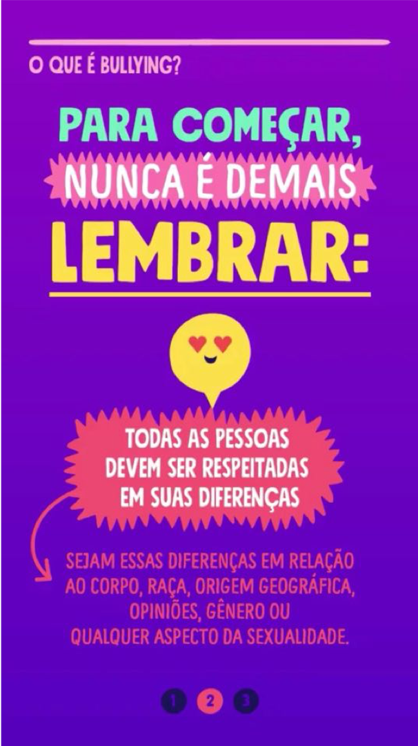 “Considerando que adolescentes e jovens são socializados em ambientes sem fronteiras entre o presencial e o virtual, esta campanha propõe a construção de espaços livres do bullying, com dicas práticas tanto para quem já sofreu, como para quem praticou ou testemunhou a violência. Este é um convite para que adolescentes e jovens usufruam o seu direito à participação e à livre expressão, estabelecendo relacionamentos saudáveis e adquirindo conhecimento e resiliência para lidar com situações que afetam o seu desenvolvimento”, diz Gabriela Mora, Oficial de Programa – Desenvolvimento e Participação de Adolescentes do UNICEF.