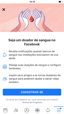 Para cadastrar-se como doador de sangue no Facebook, basta acessar o endereço facebook.com/doesangue. Usando seu dispositivo móvel também é possível acessar o menu do Facebook e então clicar em “Doações de Sangue”.