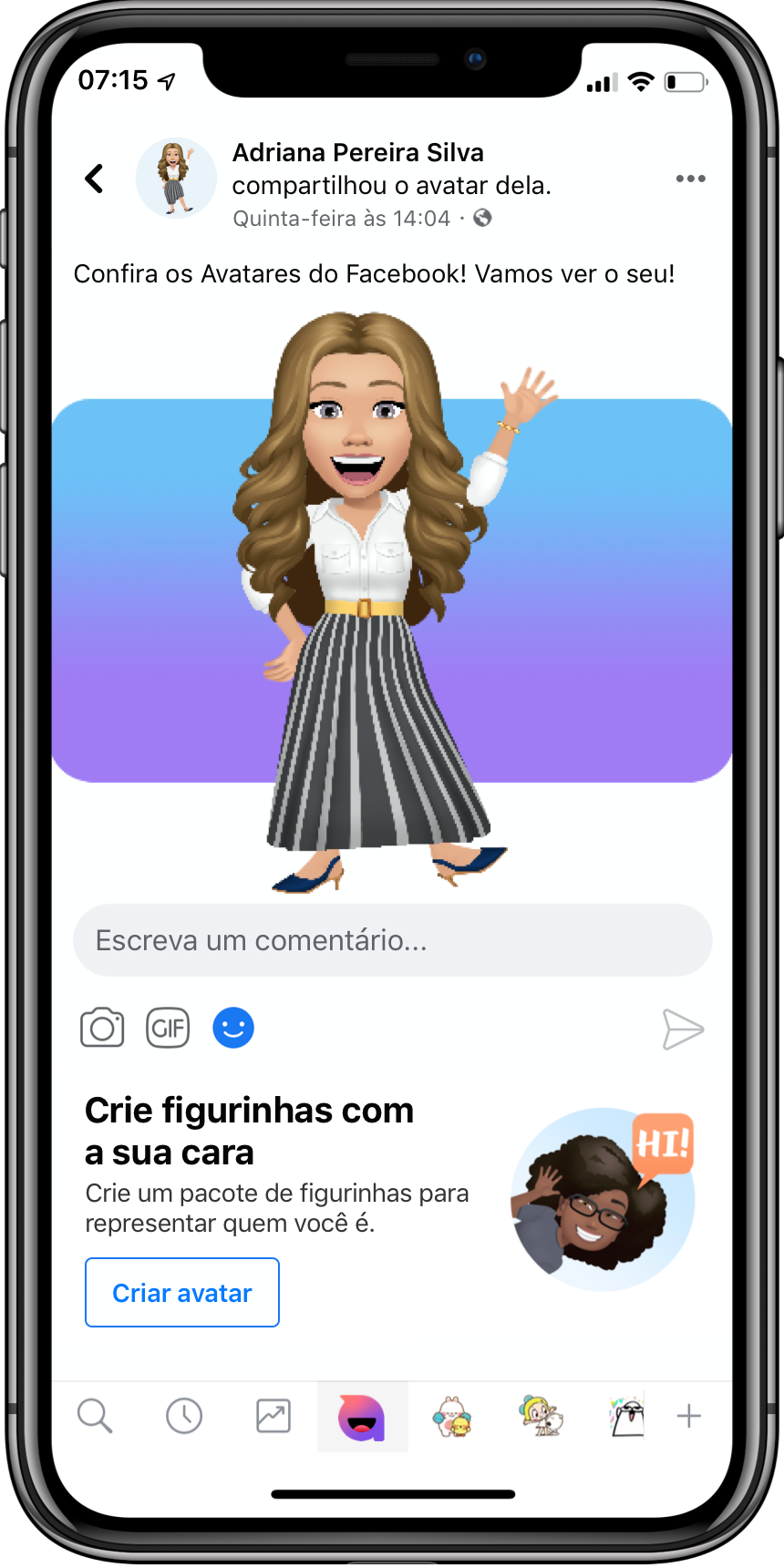 Os Avatares permitem que você compartilhe uma grande variedade de emoções e expressões por meio de um personagem digital que o representa de uma maneira única. O Avatar pode ser usado de maneiras divertidas, nos comentários dos posts no Feed de Notícias, foto de perfil, Stories e Messenger.
