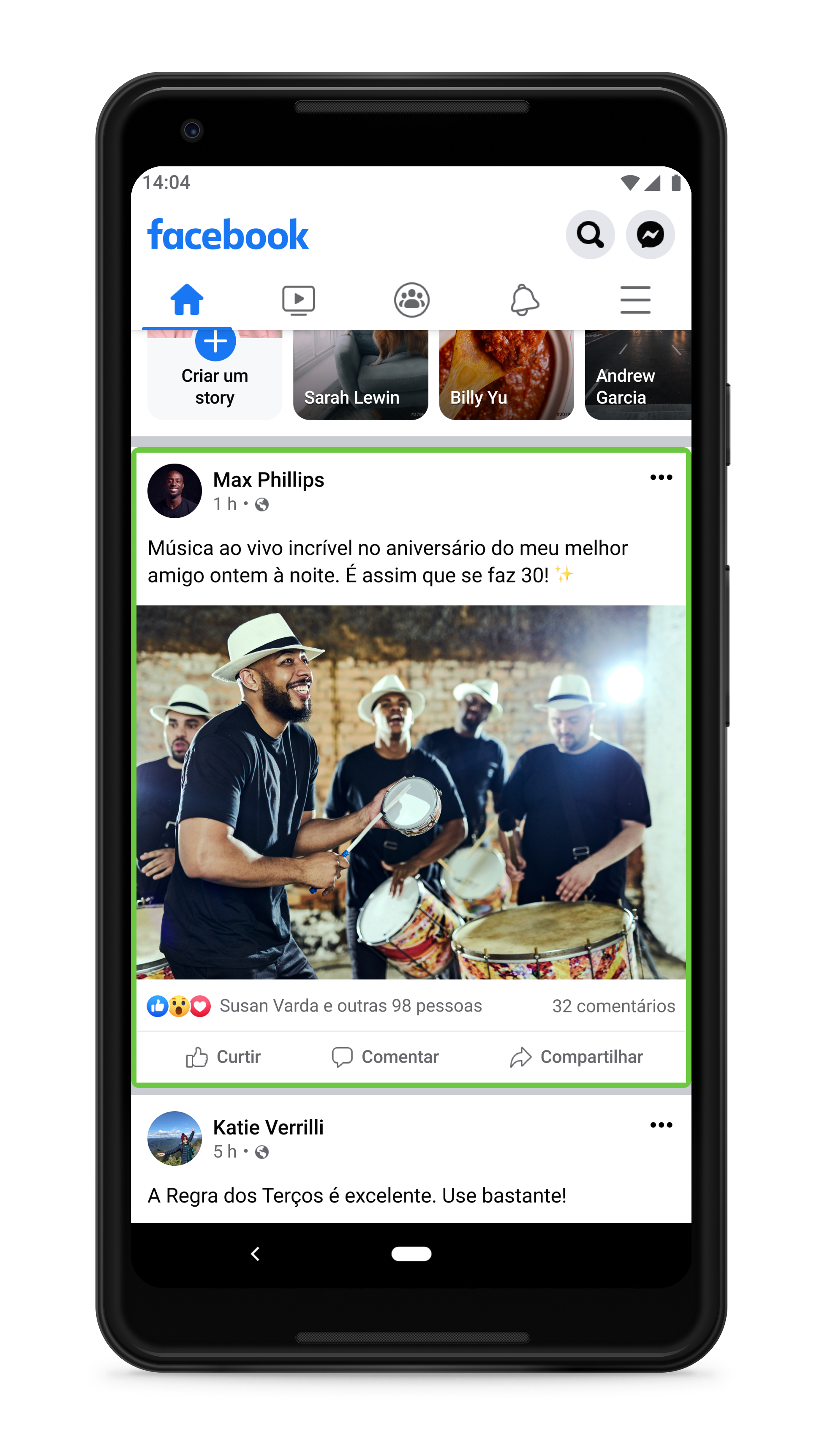 Infelizmente, muitas fotos são postadas sem texto alternativo, então, em 2016, introduzimos uma nova tecnologia chamada Texto Alternativo Automático (AAT, na sigla em inglês). O AAT — que foi reconhecido em 2018 com o prêmio Helen Keller Achievement da American Foundation for the Blind — utiliza reconhecimento de objetos para gerar descrições de fotos sob demanda, para que pessoas cegas ou com deficiência visual possam aproveitar mais plenamente seu Feed de Notícias. Temos melhorado desde então e estamos ansiosos para revelar a próxima geração de AAT.