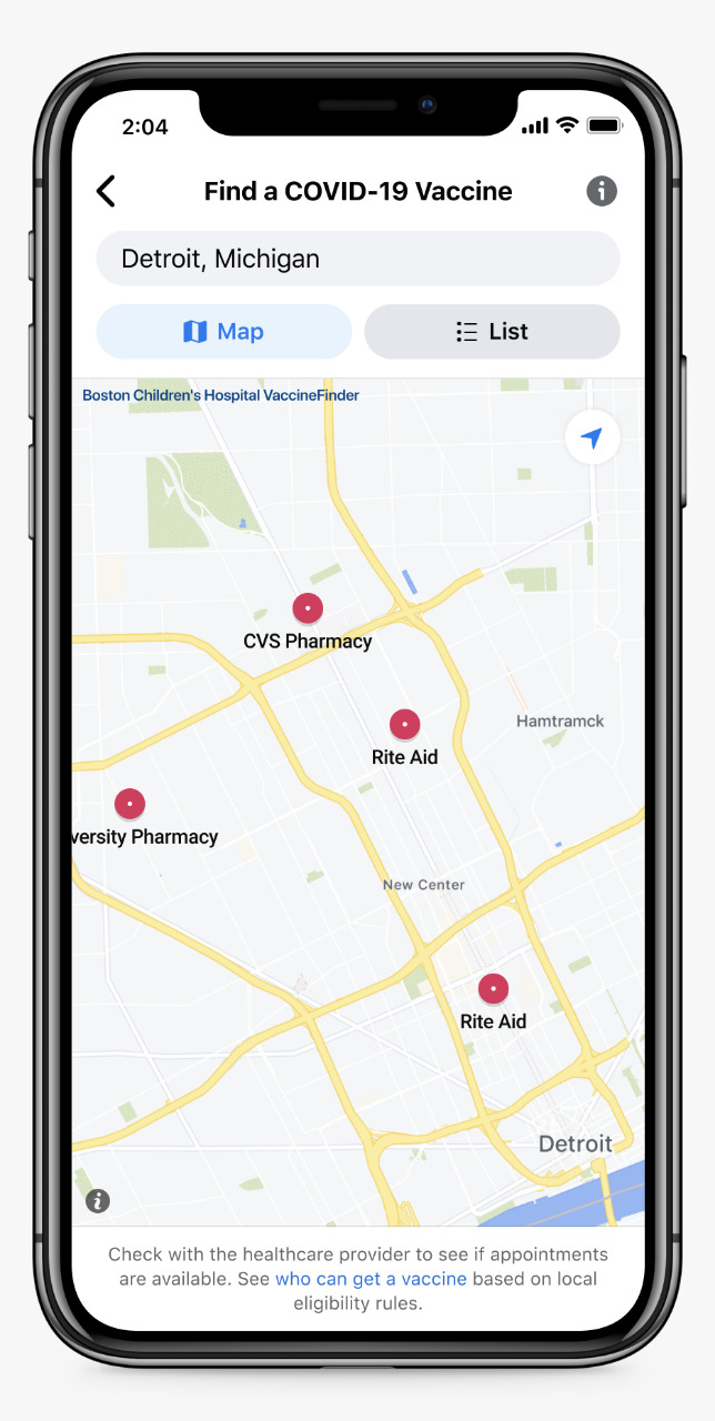 Fizemos uma parceria com o Hospital Infantil de Boston para oferecer uma ferramenta no Facebook, nos EUA, que ajudará as pessoas a identificar locais próximos para tomar a vacina. Os locais nesta ferramenta são fornecidos pelo VaccineFinder e incluem o horário de funcionamento, informações de contato e links para fazer um agendamento. As pessoas poderão acessar esta ferramenta no Centro de Informações sobre COVID-19 e ela estará disponível em 71 idiomas diferentes. Planejamos expandir para outros países conforme as vacinas forem disponibilizadas de forma mais ampla.