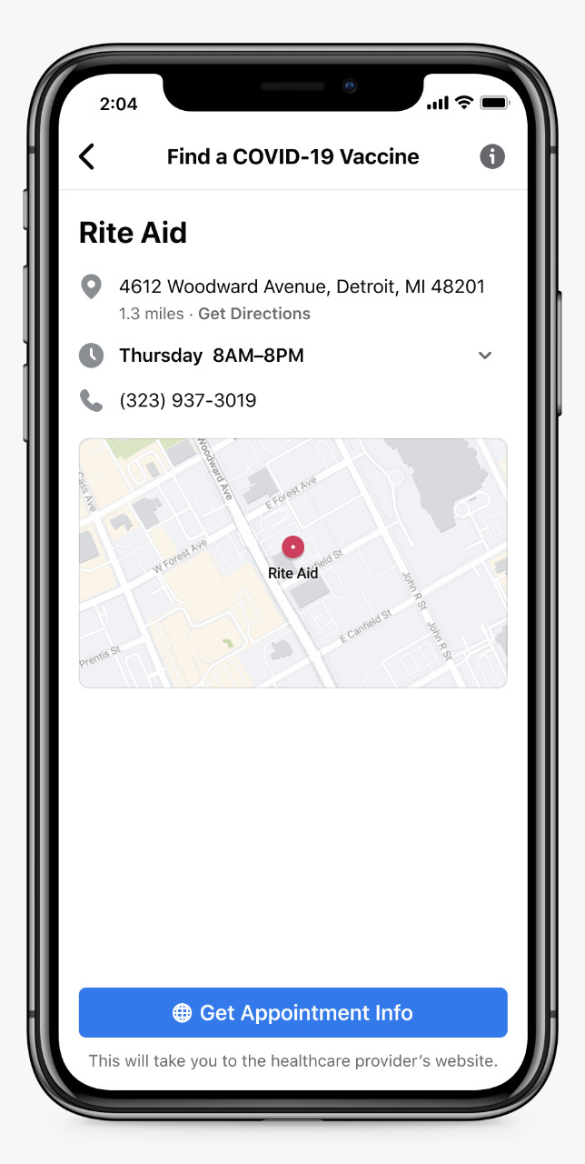 Primeiro, estamos lançando uma ferramenta que mostra quando e onde você pode ser vacinado e fornece um link para marcar uma consulta. Isso estará no Centro de Informações da Covid, que mostraremos às pessoas diretamente em seu Feed de notícias. Já vimos pessoas usarem o Facebook para encontrar horários de vacinação, então isso deve permitir que milhões de pessoas façam o mesmo.
