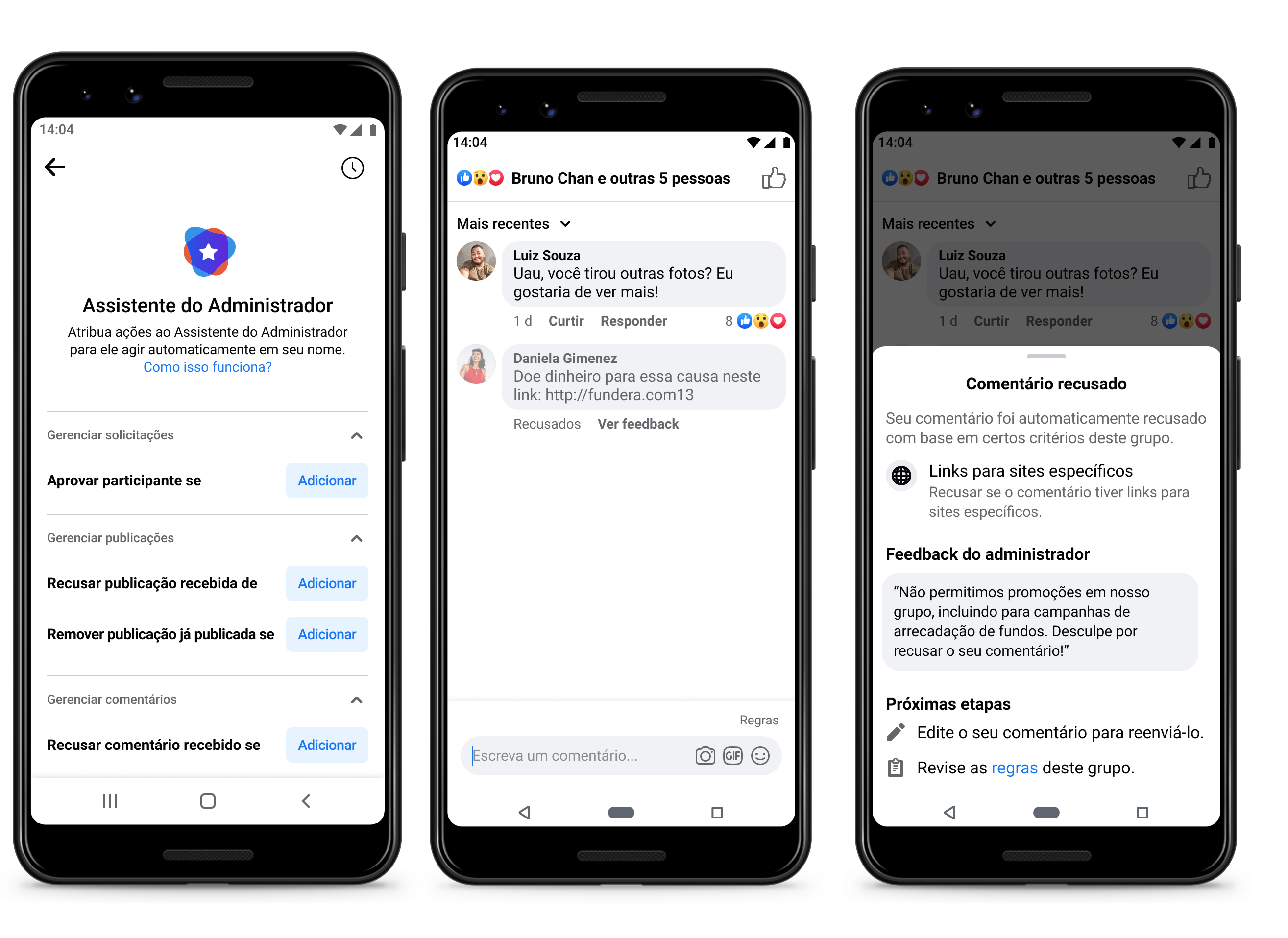 Manter a segurança nos Grupos no Facebook é uma prioridade, e os administradores são fundamentais para ajudar a preservar uma cultura segura e saudável nas suas comunidades. Ao apresentarmos a moderação de comentários no Assistente do Administrador, já disponível para desktop e dispositivos móveis, permitimos a configuração de critérios para automatizar a moderação de publicações e comentários. Com ela, os administradores podem: