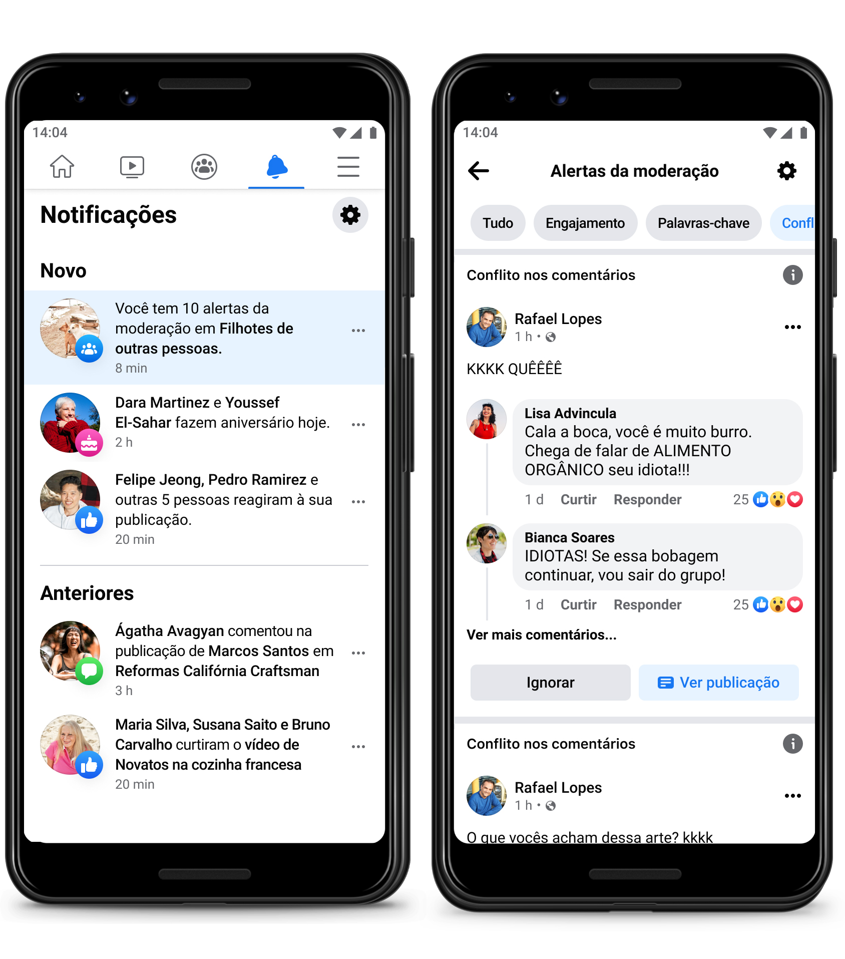 Também estamos testando um novo tipo de alerta de moderação chamado Alertas da moderação. Esse recurso usa inteligência artificial para detectar e notificar administradores quando houver conversas possivelmente controversas ou pouco saudáveis no Grupo. Assim, eles poderão agir conforme necessário.