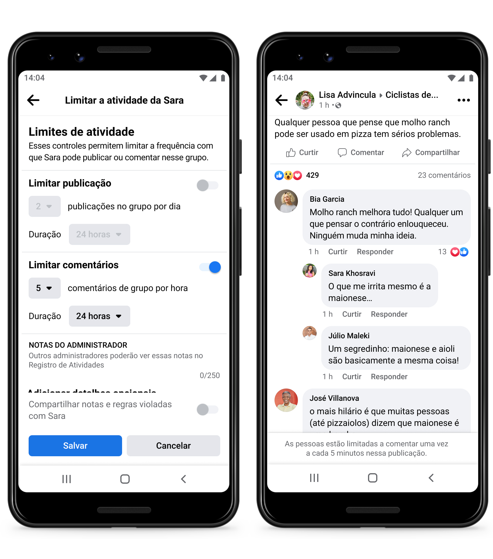 Em situações em que pode ser útil diminuir o ritmo de uma conversa, os administradores podem limitar temporariamente com que frequência membros específicos podem comentar, além de controlar com que frequência comentários podem ser feitos em publicações selecionadas.
