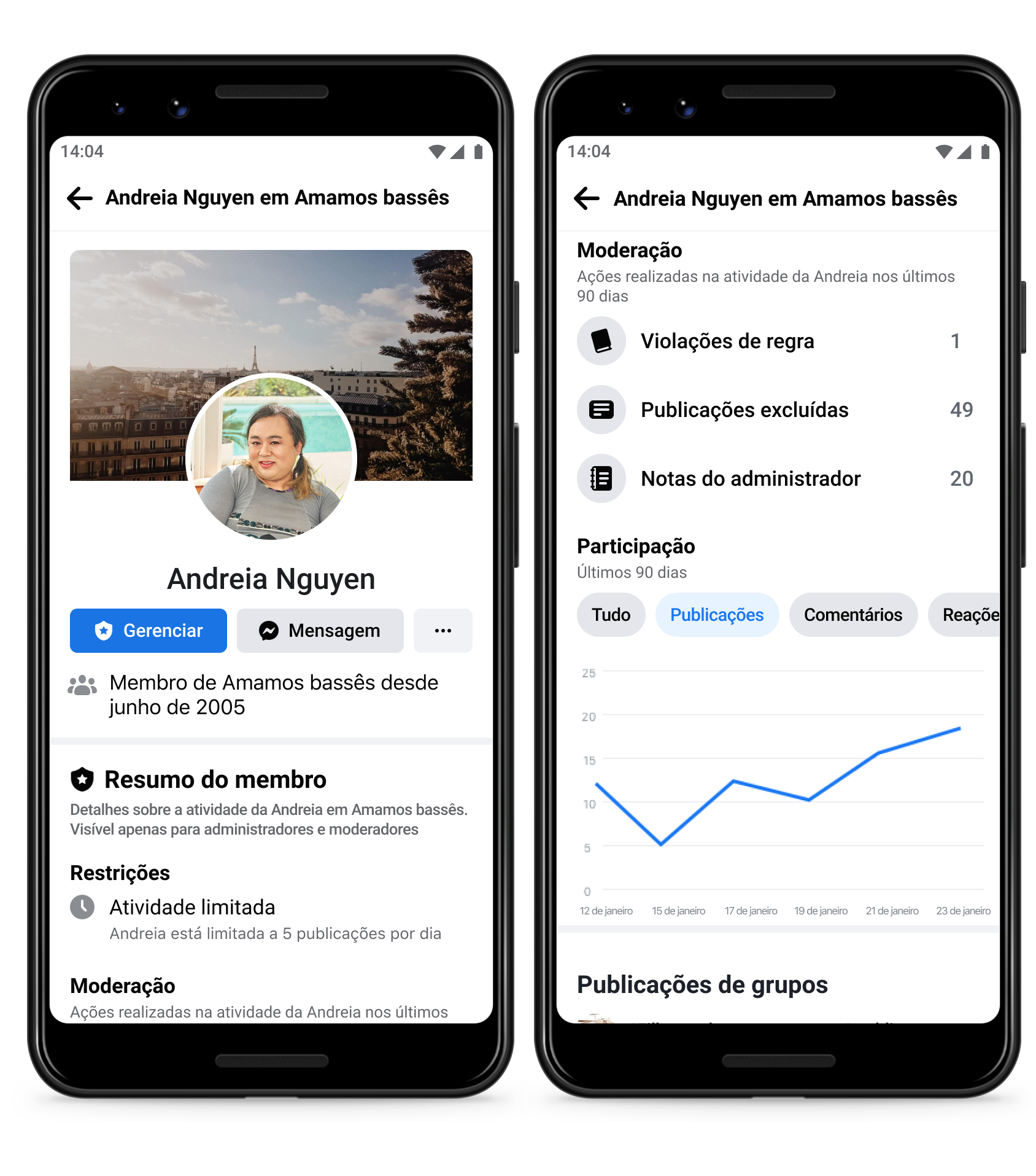Apresentamos o novo recurso Resumo do membro. Com ele, os administradores podem ver um resumo consolidado da atividade de cada membro no Grupo, como o número de vezes que a pessoa publicou e comentou ou quando teve publicações removidas ou silenciadas no Grupo.