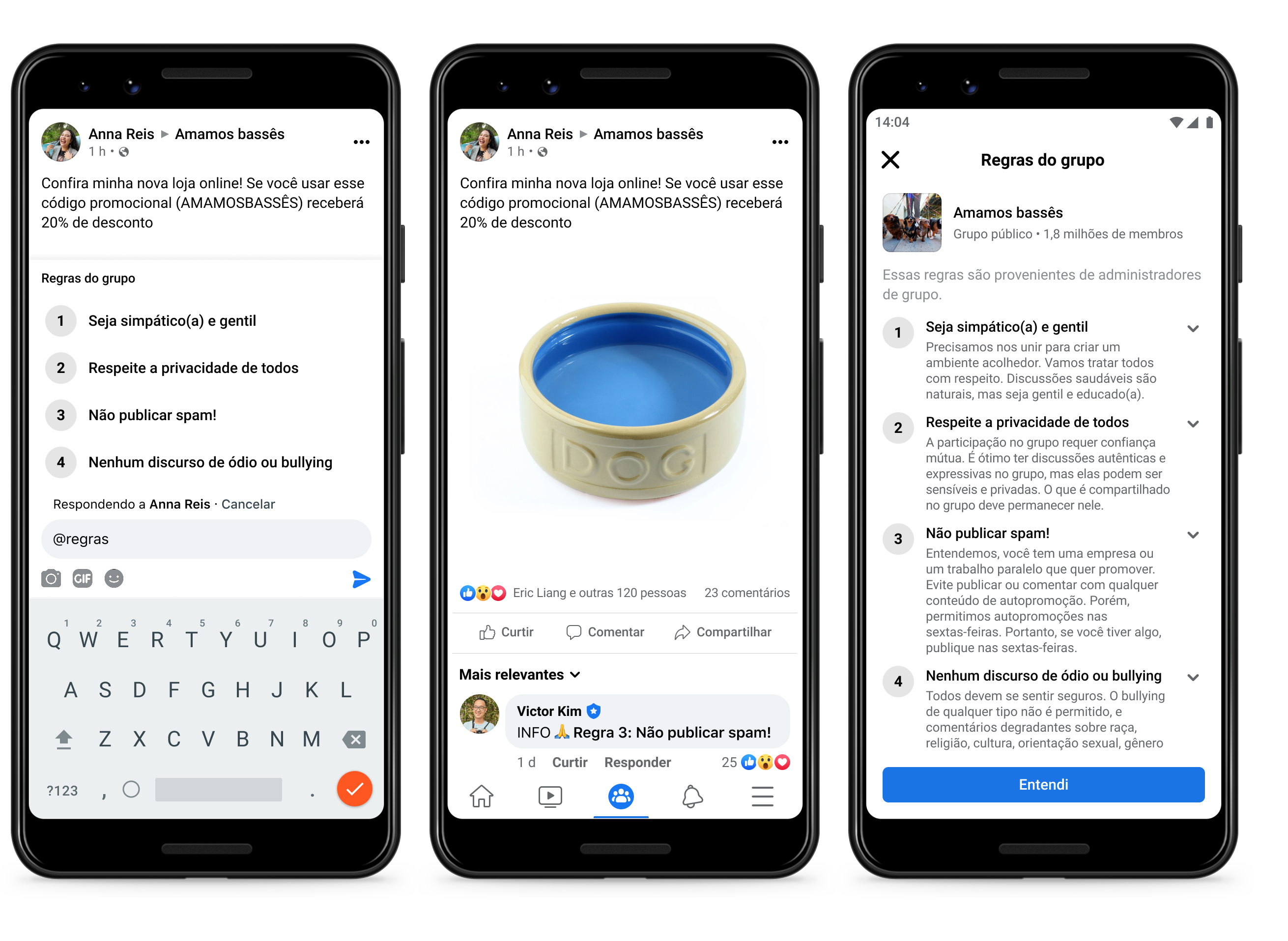 A fim de facilitar o compartilhamento e a aplicação de regras em Grupos, os administradores e moderadores já podem marcar as regras do Grupo em comentários e publicações. Além disso, os membros poderão marcar regras específicas do Grupo quando denunciarem publicações e comentários a administradores. Isso ajuda a simplificar a moderação da comunidade.