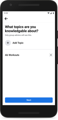 Começamos os testes dando a algumas pessoas interessadas em fitness e jogos a opção de identificar tópicos específicos sobre os quais têm conhecimento, como ioga ou um determinado jogo. Os administradores dos Grupos podem pesquisar por tópicos específicos, descobrir especialistas relevantes que ainda não são membros e convidá-los a se tornarem especialistas do Grupo.