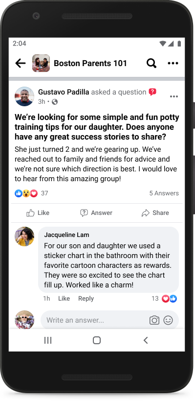 - Faça perguntas: quando alguém escreve uma publicação no Grupo que parece uma pergunta, a publicação é atualizada automaticamente para um formato que incentiva as pessoas a dar conselhos, informações ou opiniões.
