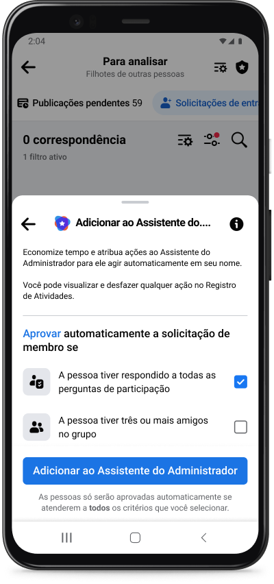 - Estamos atualizando o Assistente do Administrador para dar sugestões personalizadas sobre os critérios a serem adicionados, fornecer mais informações sobre as razões do Assistente do Administrador recusar determinado conteúdo e torná-lo acessível em todas as plataformas com disponibilidade no Facebook Lite.