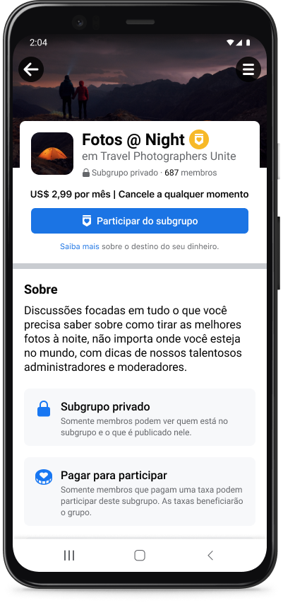 - Criar subgrupos pagos, de forma que os membros possam se inscrever e obter acesso exclusivo a mais conteúdo, experiências, como coaching, networking, ou conversas mais profundas. Como parte de nosso esforço mais amplo de assinatura paga no Facebook, esse novo recurso permite que os administradores sustentem suas comunidades, oferecendo experiências mais significativas aos membros.