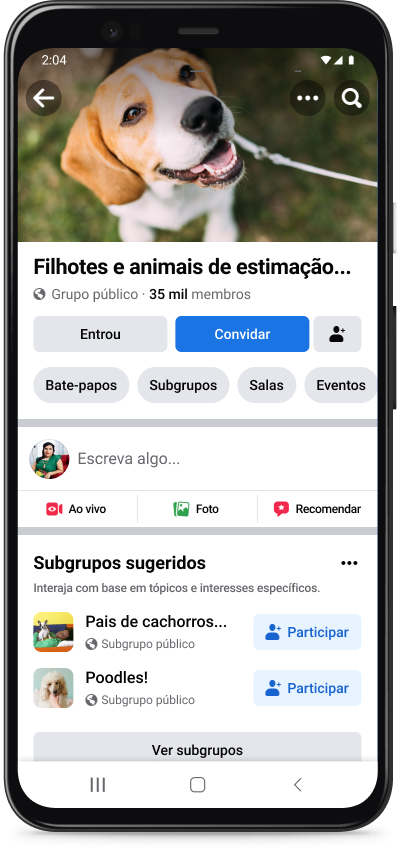Com um feed principal para discussões no Grupo, pode ser difícil para os membros encontrarem o conteúdo com o qual desejam interagir. Estamos testando a capacidade dos administradores de criar subgrupos dentro dos Grupos para tópicos, regiões ou ocasiões específicas, que podem ser gerenciados em um só lugar, para que os membros possam se aprofundar mais no que lhes interessa.