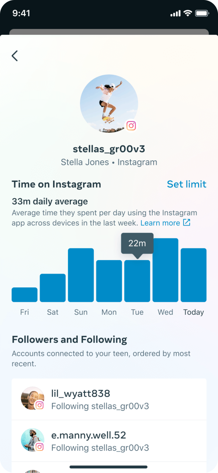 - Vejam e recebam atualizações sobre quem seus adolescentes seguem no Instagram e as contas que os seguem também.
