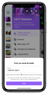 - Canais de áudio da comunidade: recurso que permite que administradores e membros do grupo entrem e saiam casualmente de conversas de áudio em tempo real. Por exemplo, se você deseja ouvir as práticas recomendadas de outros mestres da grelha em seu grupo de amantes de churrasco, pode existir um canal de áudio disponível no grupo do Facebook e no Messenger.