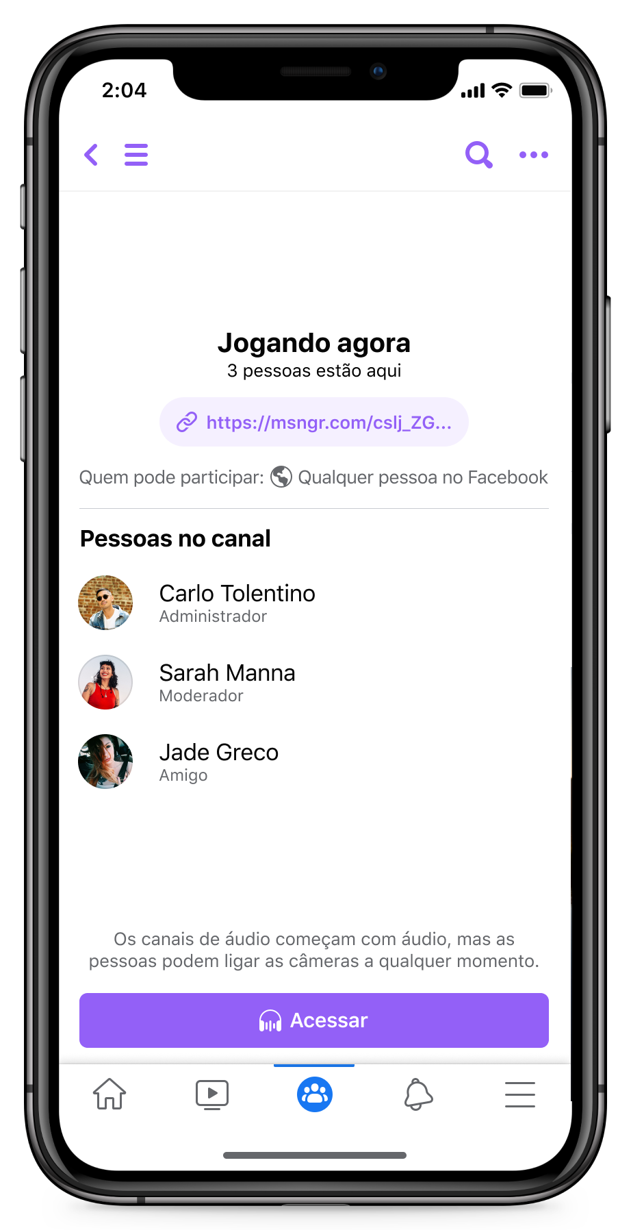- Canais de áudio da comunidade: recurso que permite que administradores e membros do grupo entrem e saiam casualmente de conversas de áudio em tempo real. Por exemplo, se você deseja ouvir as práticas recomendadas de outros mestres da grelha em seu grupo de amantes de churrasco, pode existir um canal de áudio disponível no grupo do Facebook e no Messenger.