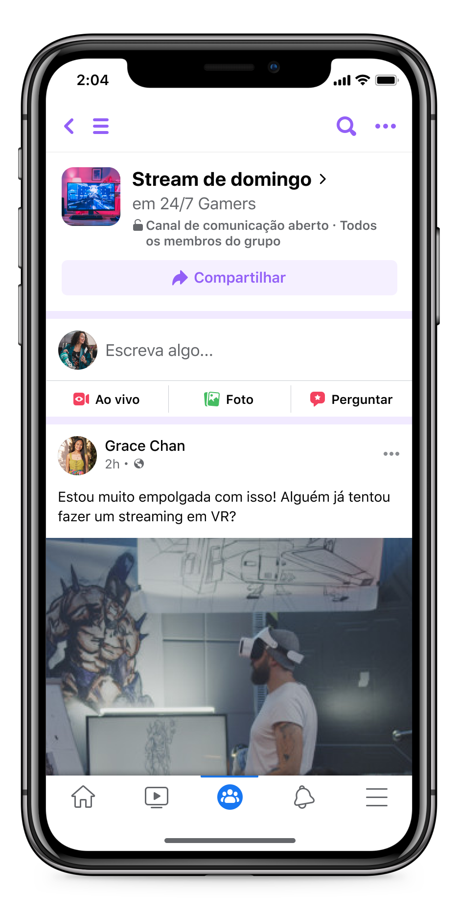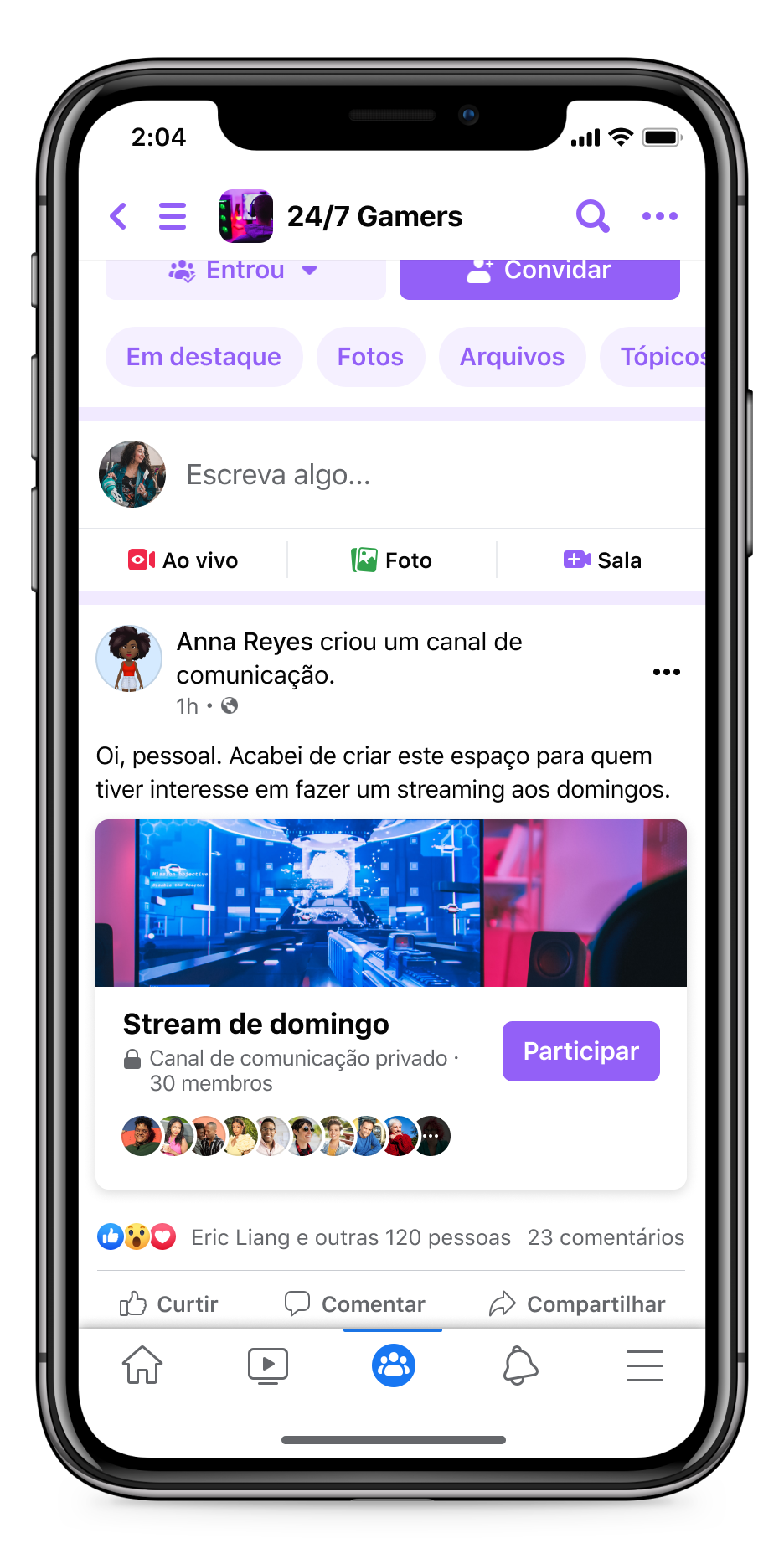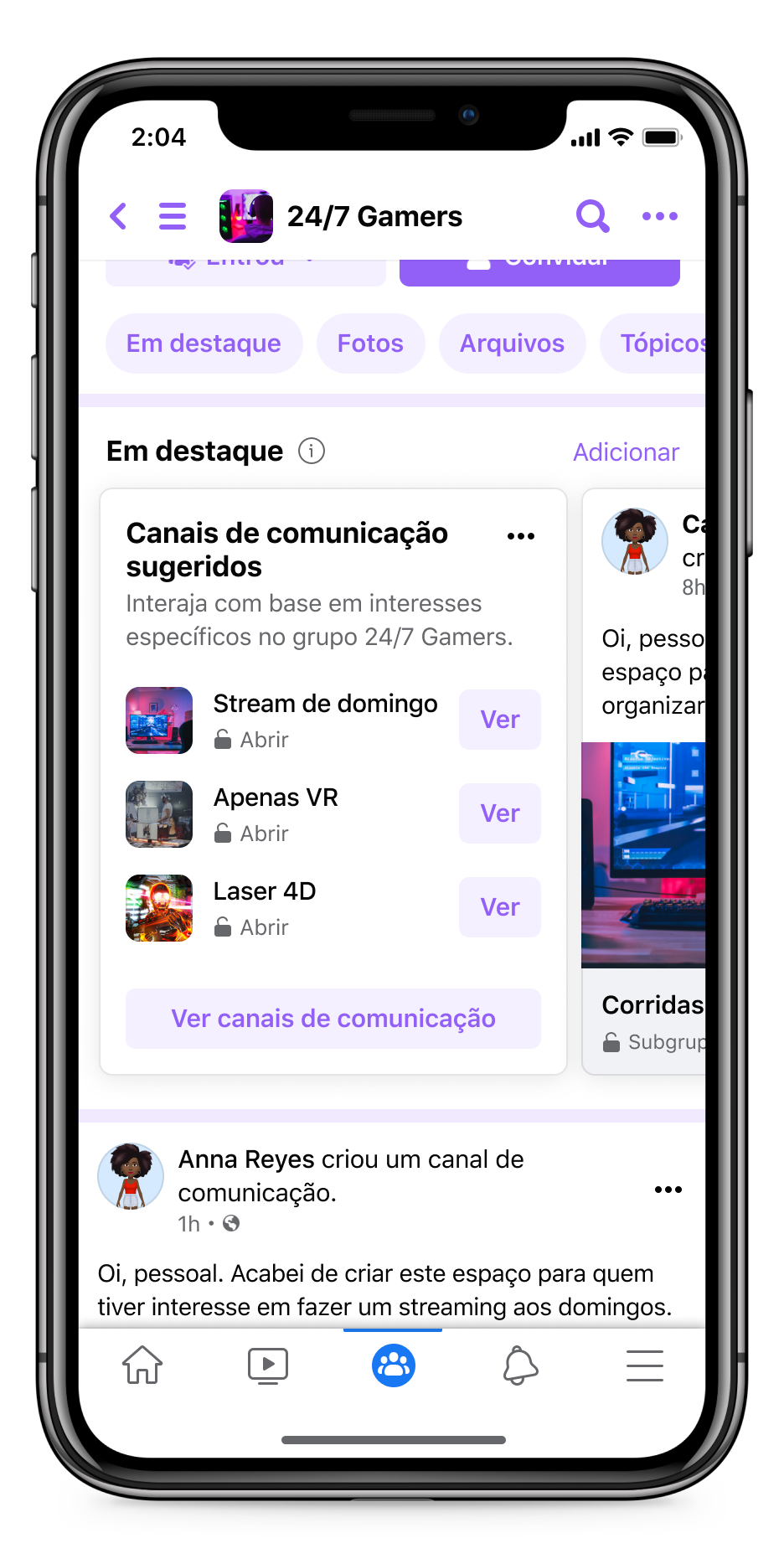 Estamos melhorando a organização de cada grupo, para que você possa ir direto ao que há de novo. Dentro do seu grupo, você verá um novo menu que inclui eventos e uma variedade de canais para facilitar a conexão com outras pessoas sobre os tópicos de seu interesse. Assim, quando estiver em seu grupo de culinária, você poderá se manter atualizado sobre os próximos eventos e participar de conversas mais facilmente.