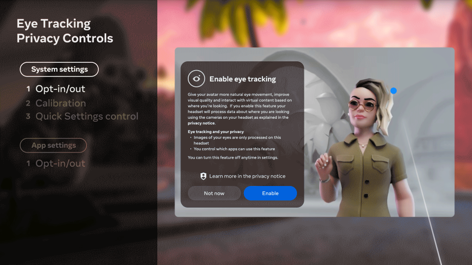 O processo de configuração para rastreamento ocular e Expressões Faciais Naturais é transparente e fácil de entender. Ao configurar o headset Meta Quest Pro, as pessoas terão a opção de ativar esses recursos. Para isso, receberão avisos claros de como eles funcionam, além de links para nossos avisos de privacidade para saber mais.