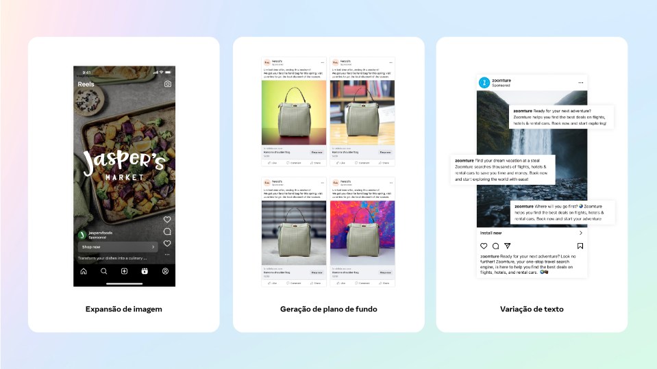 Hoje, estamos anunciando que começamos a disponibilizar nossos primeiros recursos alimentados por IA generativa para criativos de anúncios no Gerenciador de Anúncios da Meta, com disponibilidade global a ser concluída no próximo ano. Isso habilita uma nova era de criatividade que maximiza a produtividade, a personalização e o desempenho para todos os anunciantes. Os novos recursos – Geração de plano de fundo, Expansão de imagem e Variação de texto – se somarão às experiências e ferramentas alimentadas por IA que continuamos a criar para as empresas.