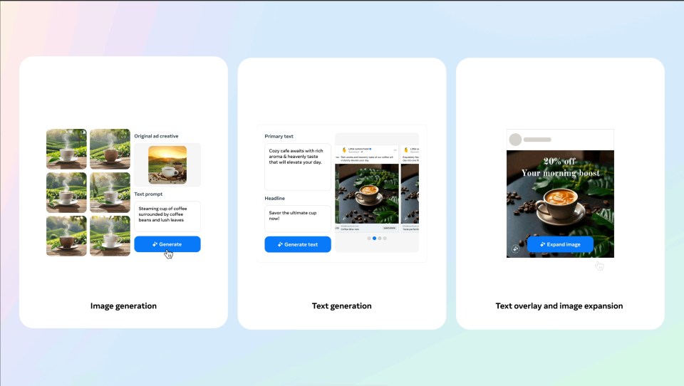 Pela primeira vez, você pode criar variações completas de imagens inspiradas no criativo original do seu anúncio, com recursos de sobreposição de texto. Isso abrange a utilização de ferramentas para criar novos planos de fundo em torno das imagens dos produtos e redimensionar as imagens para uma melhor adaptação a diversas superfícies. Por exemplo, imagine que você esteja promovendo seu negócio de café em grão anunciando uma xícara de café que acabou de ser preparada: nossa IA generativa poderá criar outras variações do seu criativo de anúncio, incluindo um cenário que incorpora uma bela fazenda, além de fornecer ajustes na xícara de café para oferecer mais opções criativas para que você possa escolher. Esse recurso já começou a ser implementado e, nos próximos meses, você também poderá fornecer instruções de texto para nos ajudar a adaptar melhor as variações criativas que oferecemos a você.
