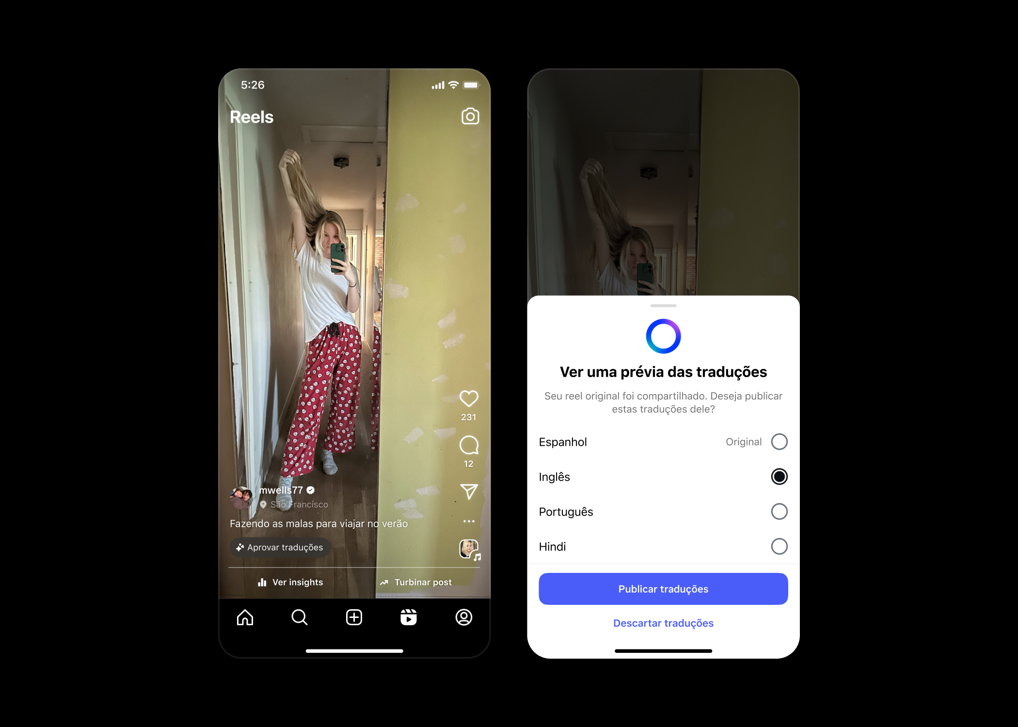 No mês passado, ampliamos o acesso às traduções entre inglês e espanhol (e vice-versa) para criadores no Facebook e Instagram, permitindo que mais pessoas traduzam seus reels de forma simples com a Meta AI. Hoje, estamos felizes em anunciar a inclusão de mais dois idiomas: português e hindi, tornando ainda mais fácil assistir reels de criadores do mundo todo – e em breve teremos ainda mais opções.