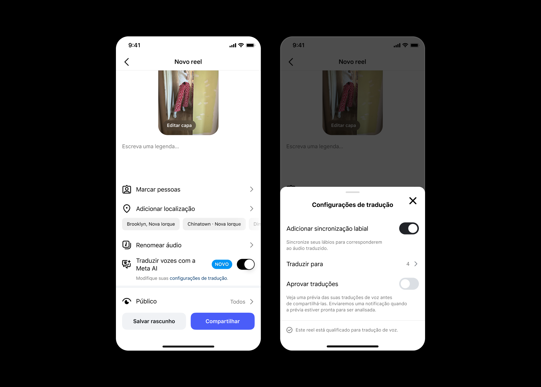 Traduzir reels com a Meta AI é gratuito e está disponível para criadores do Facebook com 1.000 seguidores ou mais, e para todas as contas públicas do Instagram em países onde a Meta AI está disponível.