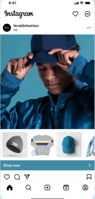 Com a vitrine de produtos (product showcase), os profissionais de marketing podem carregar uma imagem ou vídeo como seu criativo principal, e a IA da Meta incluirá automaticamente produtos do seu catálogo em formato de carrossel caso isso tenha maior probabilidade de melhorar o desempenho.