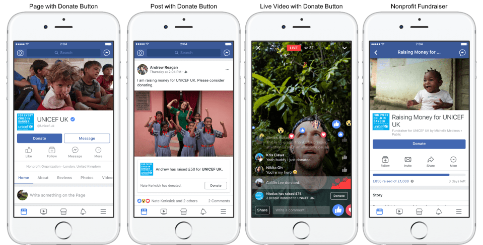 - Spenenaufrufe in Facebook Live: Ariana Grandes Benefizkonzert zu Ehren der Opfer des Anschlags in Manchester erzielte mithilfe eines „Spenden“-Buttons in Facebook Live mehr als 450.000 Dollar. Einzelpersonen und verifizierte Facebook-Seiten können den Spenden-Button auf iOS direkt zu ihren Live-Sendungen hinzufügen. Android-Nutzer, die einen Spendenaufruf erstellt haben, können ihre Spendenaktion an ihr Live anhängen.