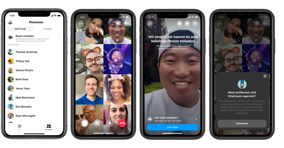 Messenger Rooms macht das Zusammensein einfach und ermöglicht es, gemeinsam zu feiern, gemeinschaftliche Treffen zu organisieren oder einfach virtuell mit den Freunden auf der Couch zu entspannen. Bald bieten die Räume Platz für bis zu 50 Personen gleichzeitig – zeitlich unbegrenzt und ganz egal wie lange die virtuelle Happy Hour, das Gruppentraining oder die Geburtstagsparty dauert. In den nächsten Wochen wird auch die Möglichkeit zum Erstellen von Räumen aus Instagram Direct, WhatsApp und Portal ergänzt.