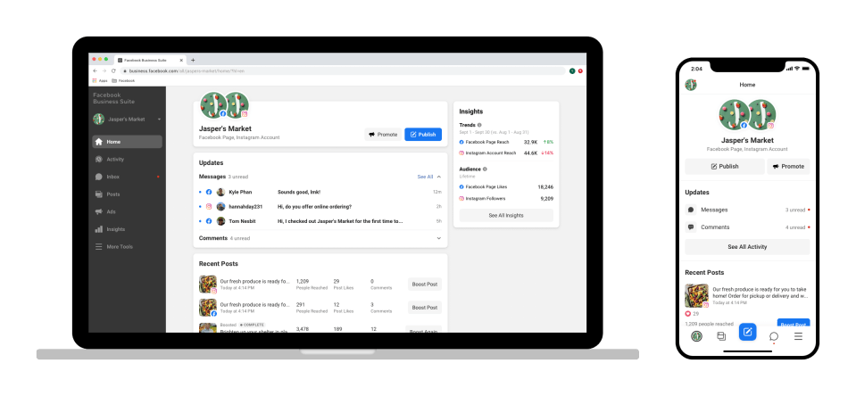 Aus diesem Grund stellen wir heute das neue App-übergreifende Interface Facebook Business Suite vor: Das erlaubt es Unternehmerinnen und Unternehmern, ihre Facebook- und Instagram-Profile zentral zu verwalten und sowohl organische Inhalte als auch Werbeanzeigen zu organisieren: