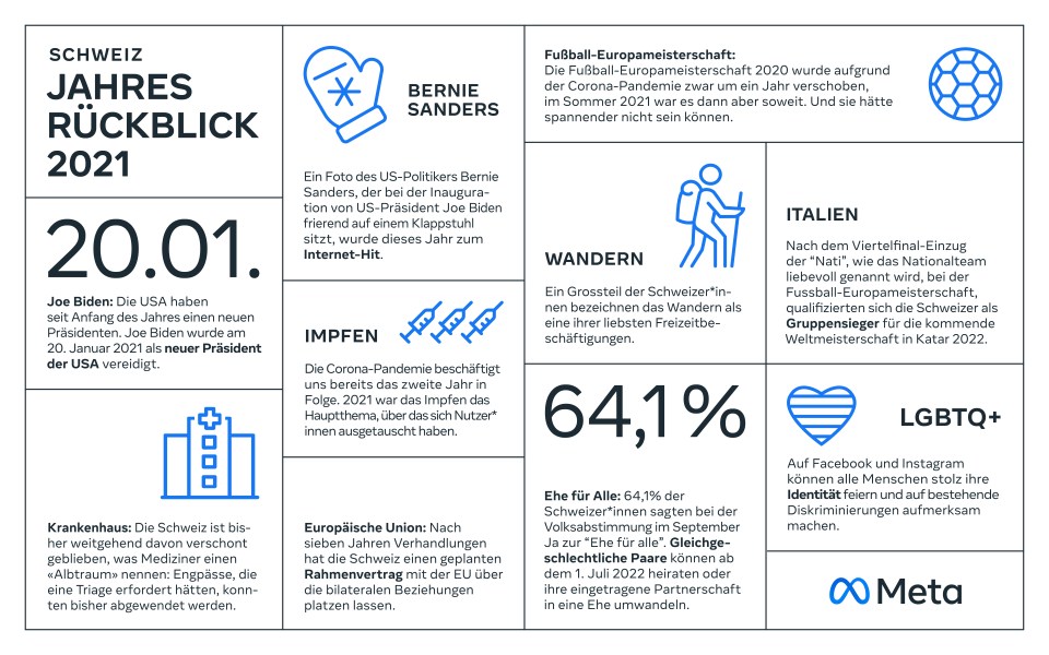 Das Jahr 2021 neigt sich dem Ende entgegen. Im Jahresrückblick zeigen wir die wichtigsten Anlässe und Themen, zu denen sich die Menschen in der Schweiz auf Facebook und Instagram ausgetauscht haben. Außerdem veröffentlichen wir die Hashtags und Songs, die auf unseren Plattformen am meisten verwendet wurden.
