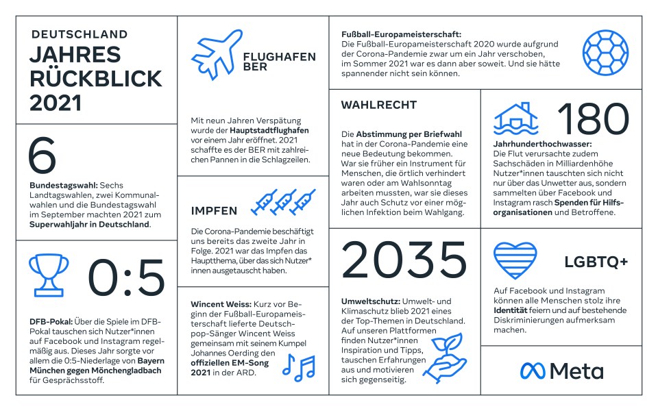 Das Jahr 2021 neigt sich dem Ende entgegen. Im Jahresrückblick zeigen wir die wichtigsten Anlässe und Themen, zu denen sich die Menschen in Deutschland auf Facebook und Instagram ausgetauscht haben. Außerdem veröffentlichen wir die Hashtags und Songs, die auf unseren Plattformen am meisten verwendet wurden.