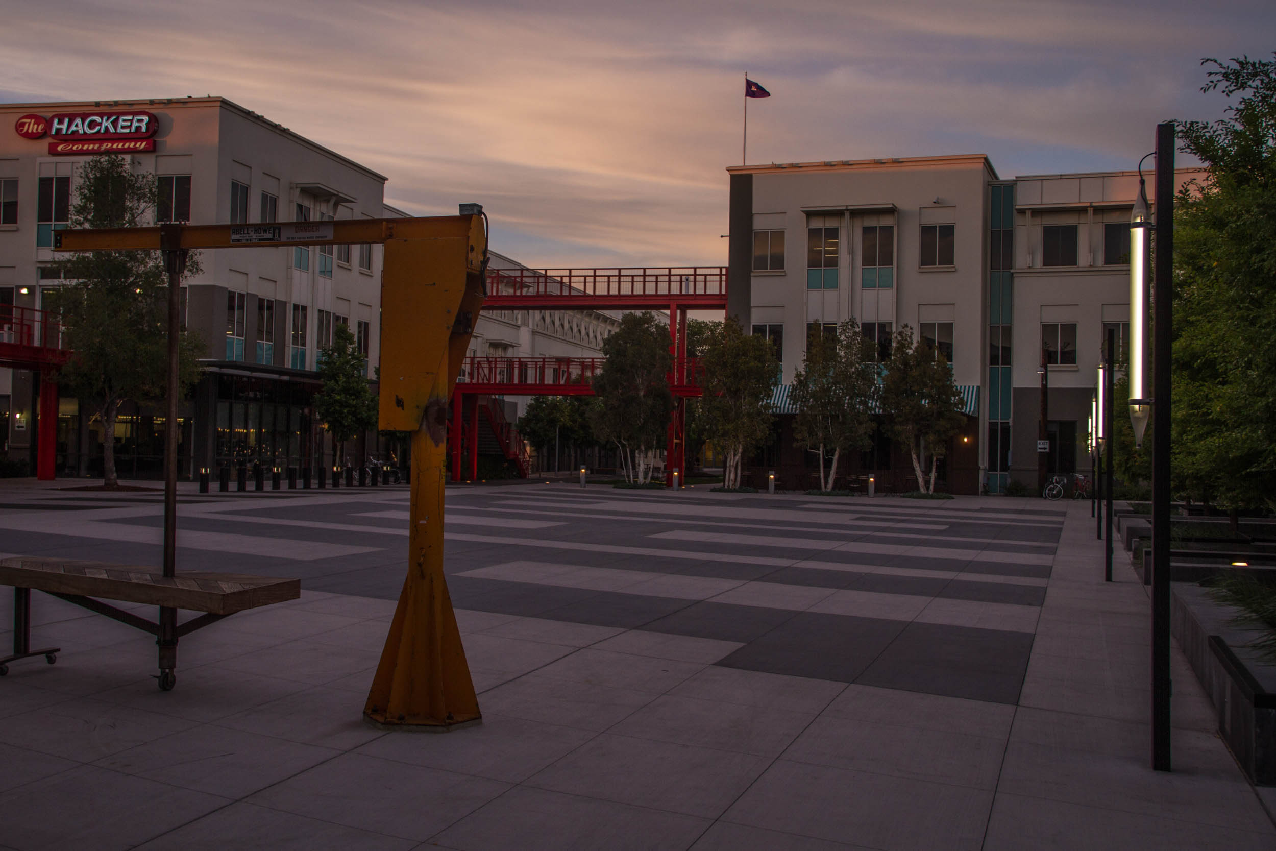 El sol se pone en el patio de la oficina central de Facebook, un lugar de reunión llamado «Hacker Square».
