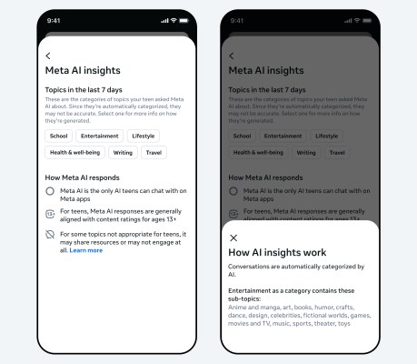 Aquellos padres que utilicen la supervisión parental en Facebook, Messenger o Instagram ahora podrán ver la nueva pestaña «Insights» en la sección de supervisión, disponible tanto en la aplicación como en la web. Allí podrán consultar sobre qué temas le han preguntado sus hijos adolescentes a la IA de Meta durante la última semana en cada aplicación concreta. Los temas pueden ir desde el colegio, el entretenimiento y el estilo de vida hasta los viajes, la escritura y la salud y el bienestar, entre otros.