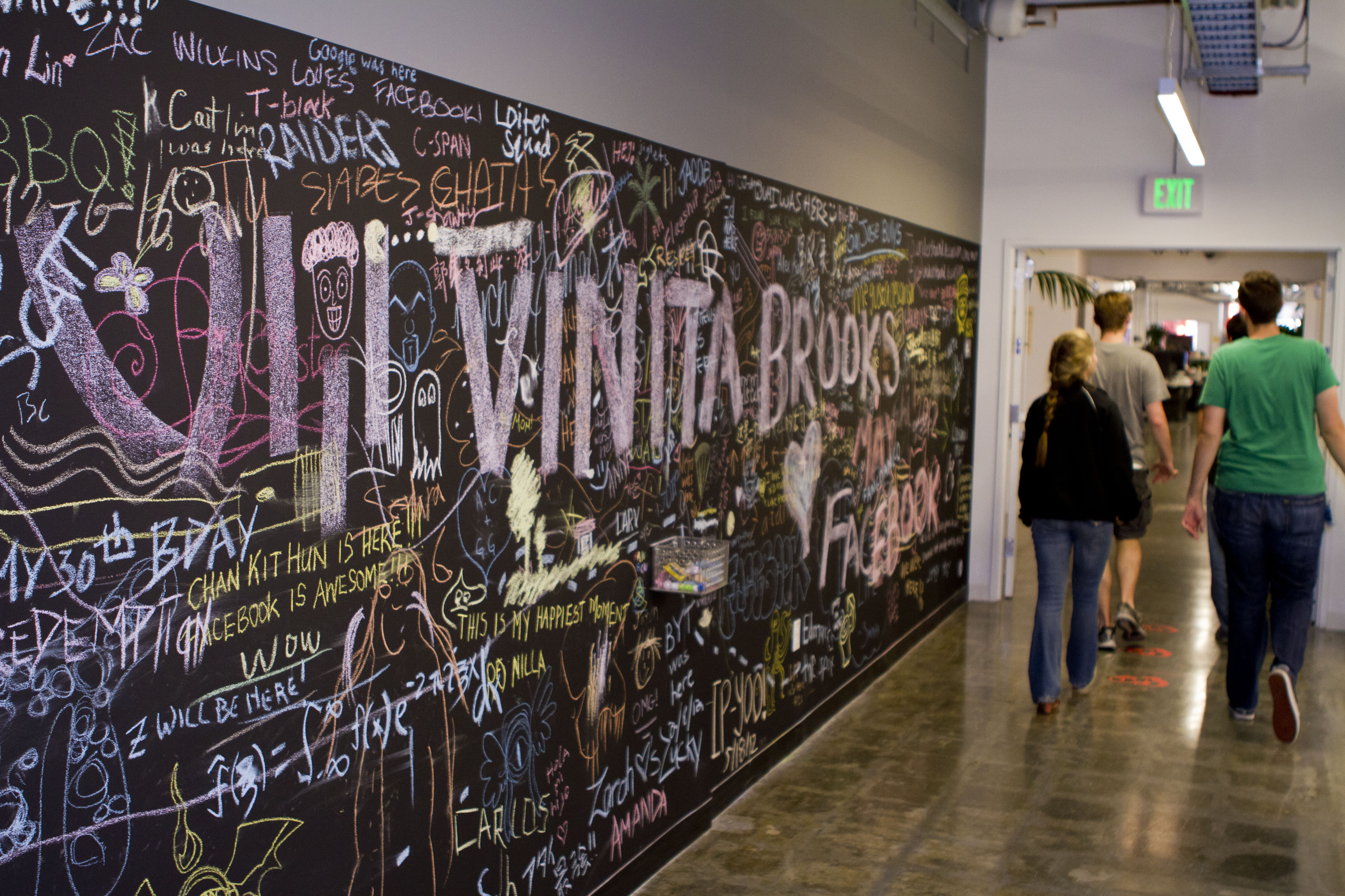 Un mur en tableau noir avec les dessins et les notes à la craie des employés au siège social de Facebook