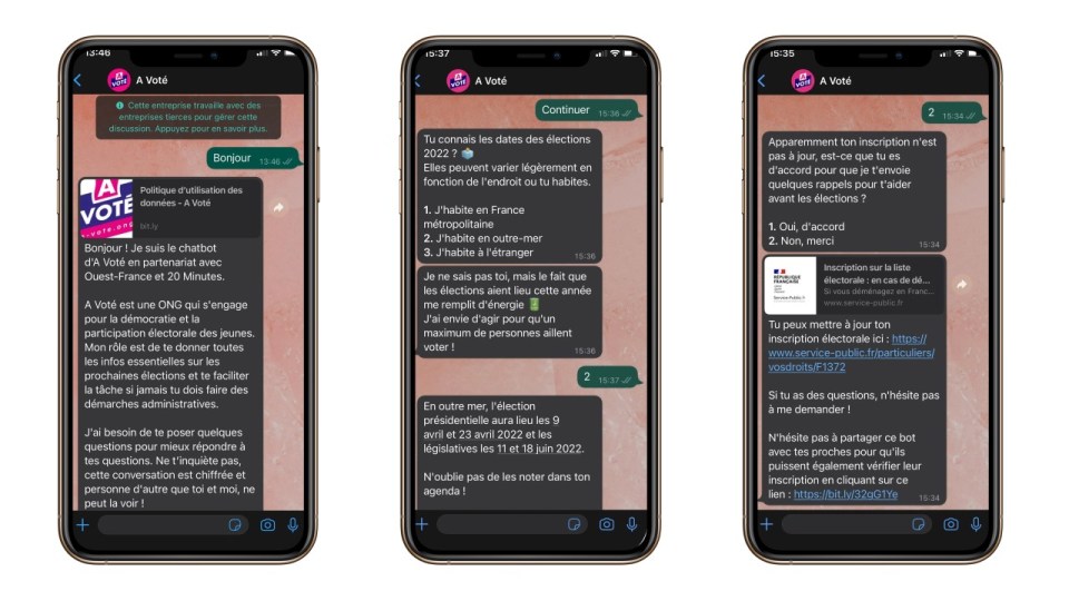 A la veille des élections présidentielle et législatives françaises du printemps 2022, l’association A Voté, en partenariat avec Meta France, Ouest-France et 20 Minutes, lance le premier chatbot sur WhatsApp en France pour encourager la participation des jeunes à ces scrutins en les aidant à s’inscrire sur les listes électorales et à retrouver toutes les informations nécessaires à l’exercice de leur vote.