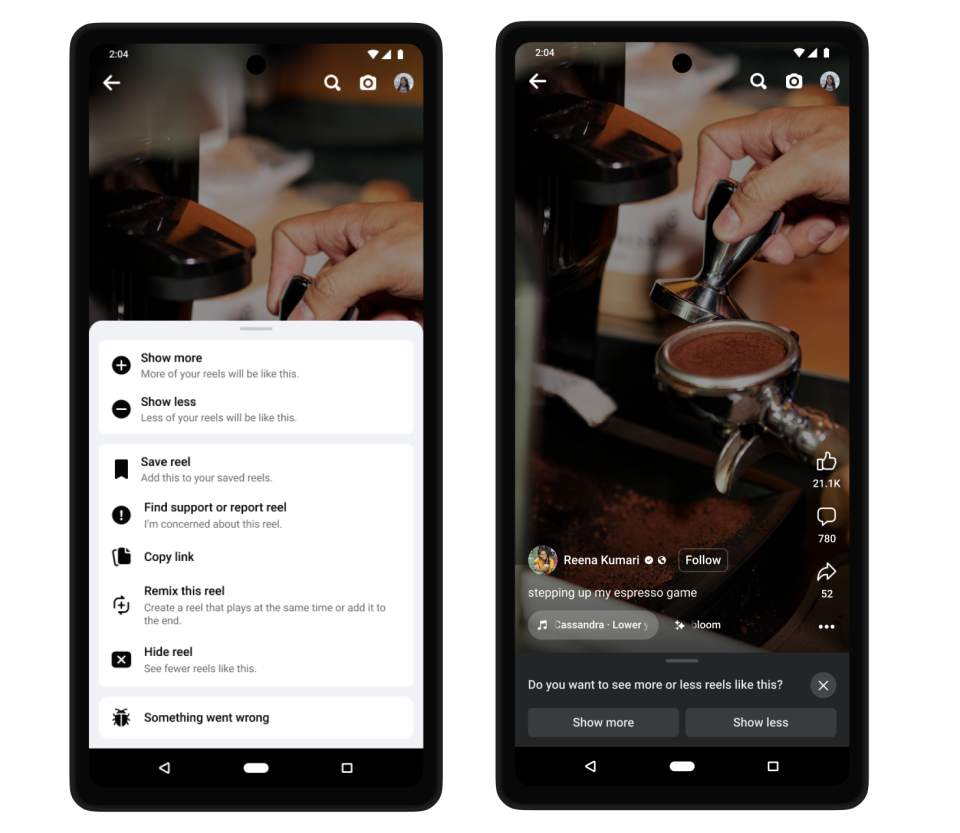 - Nous annonçons de nouveaux outils de personnalisation pour Reels sur Facebook permettant de trier les catégories de reels que chaque utilisateur souhaite voir plus ou moins et ainsi améliorer son expérience.