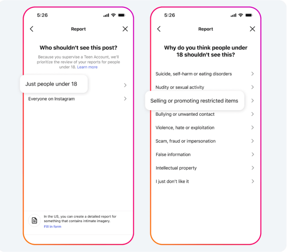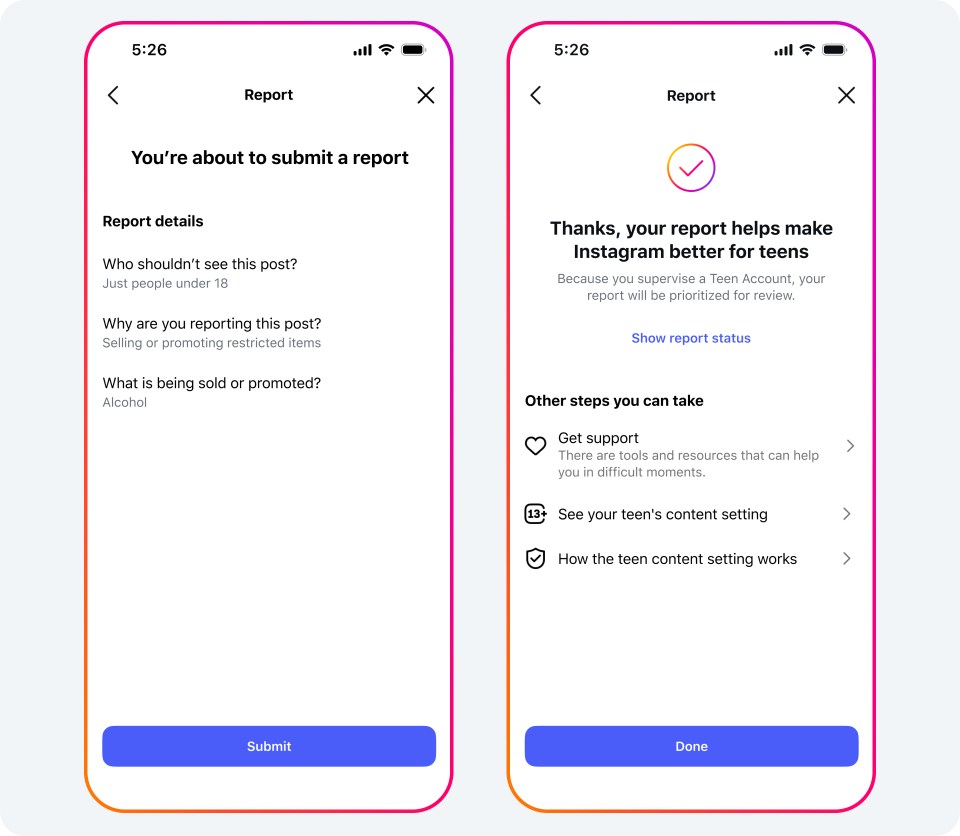 Nous testons également un nouveau moyen pour les parents utilisant les outils de supervision de signaler toute publication qu’ils voient sur Instagram et qu’ils estiment devoir être masquées aux adolescents, en nous expliquant pourquoi. Si ces publications ne sont pas déjà masquées, nous les transmettrons à nos équipes pour un examen prioritaire, et nous informerons le parent du résultat.