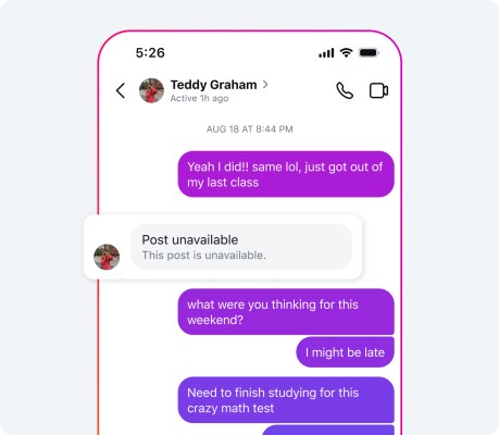 - Expérience de contenu : Les adolescents ne verront pas de contenu contraire à nos nouvelles directives dans les recommandations (Explore, Reels et fil d’actualité), le fil principal et les Stories, même lorsqu’il est partagé par quelqu’un qu’ils suivent, ni dans les commentaires. Si quelqu’un envoie à un adolescent un lien vers ce type de contenu par Message Direct, ce dernier ne pourra pas l’ouvrir.