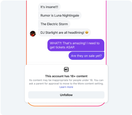 - Comptes : Les adolescents ne pourront plus suivre des comptes que nous avons identifiés comme partageant régulièrement du contenu inadapté à leur âge, ou dont le nom ou la bio suggère que le compte n’est pas approprié pour les adolescents. Si des adolescents suivent déjà ces comptes, ils ne pourront plus voir ni interagir avec leur contenu, leur envoyer des Messages Directs, ou encore visualiser leurs commentaires apparaissant sous les publications de tiers. Nous ne recommanderons pas ces comptes aux adolescents, et nous rendrons plus difficile leur découverte via l’outil de recherche. Ces protections fonctionnent dans les deux sens : ces comptes ne pourront pas suivre les adolescents, leur envoyer des Messages Directs ni commenter leurs publications.