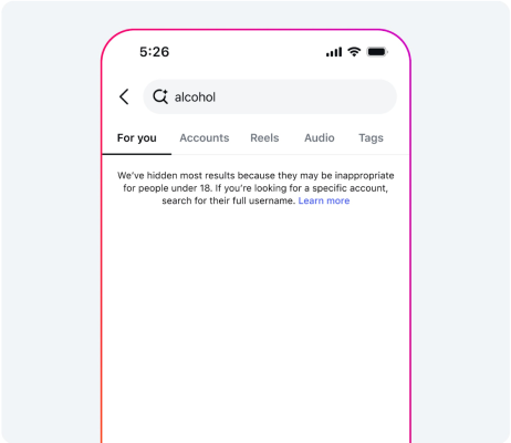 - Recherche : Nous bloquons déjà les termes de recherche liés à certains sujets sensibles, comme le suicide, l’automutilation et les troubles alimentaires. Désormais, nous étendons ce blocage à d’autres résultats de recherche destinés à un public mature, comme « alcool » ou « gore » et nous veillons à ce que ces termes restent bloqués même en cas de faute de frappe.