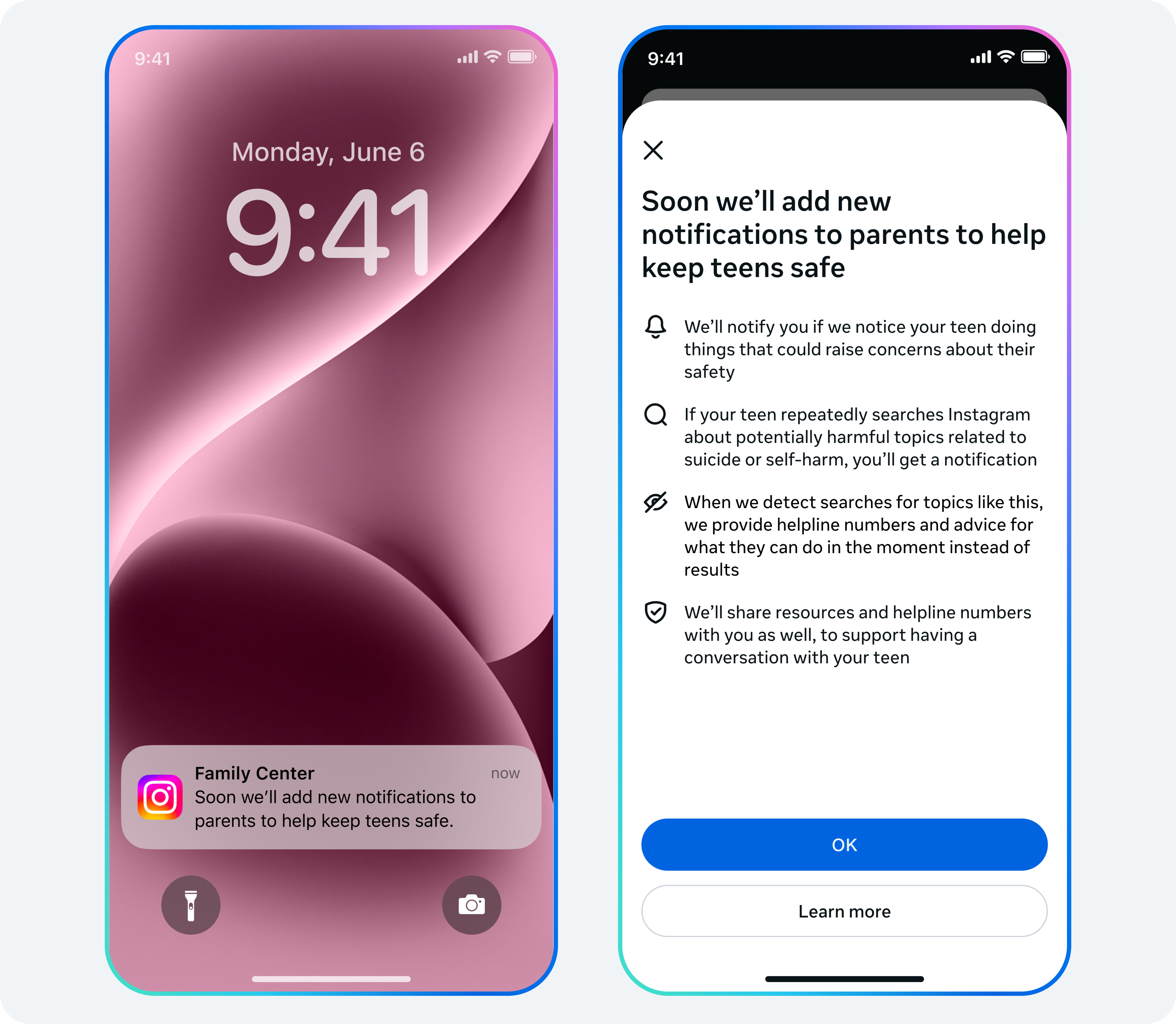 Dans les prochaines semaines, Instagram commencera à notifier les parents utilisant la supervision parentale si leur adolescent tente à plusieurs reprises de rechercher des termes liés au suicide ou à l’automutilation sur une courte période. Il s’agit de la dernière mesure de protection en date déployée par le groupe en lien avec les Comptes Adolescents et les outils de supervision parentale d’Instagram.
