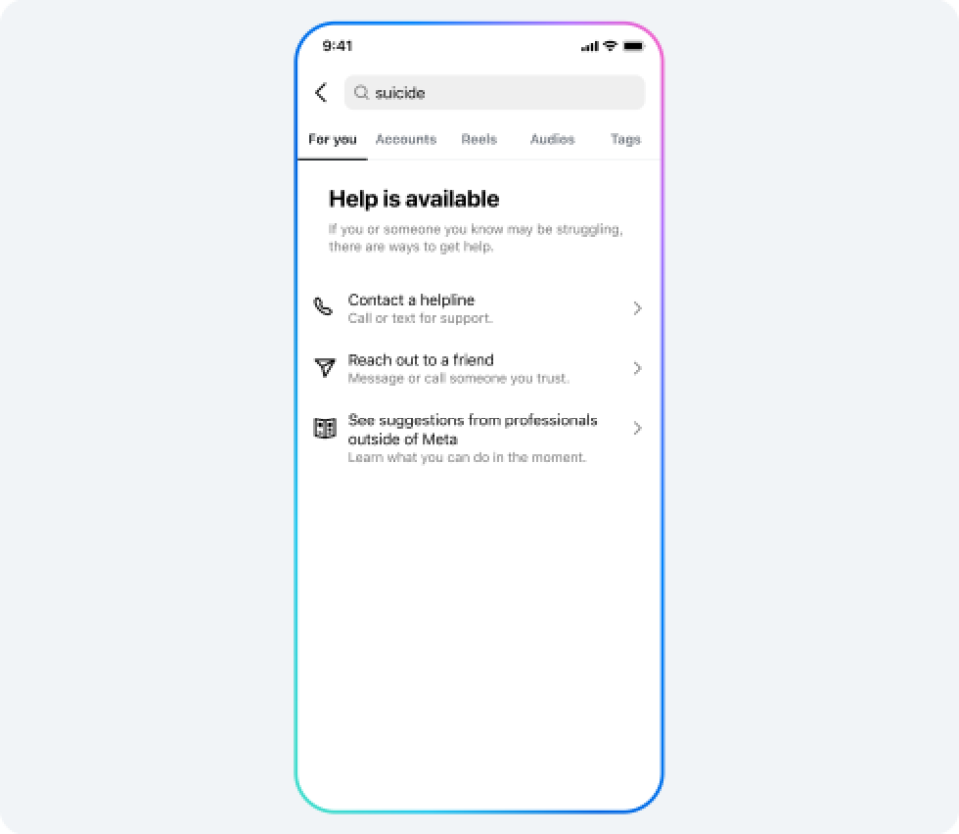 Nous travaillons à bloquer les recherches de termes clairement liés au suicide et à l’automutilation, y compris ceux qui violent nos politiques sur le suicide et l’automutilation. Cela signifie que nous n’affichons aucun résultat et orientons plutôt les personnes vers des ressources et des organisations locales pouvant les aider. Nous orientons également nos utilisateurs vers des ressources et des lignes d’assistance lorsque leurs recherches ne sont pas directement liées au suicide ou à l’automutilation, mais concernent la santé mentale de manière plus générale. Nous continuons à alerter les services d’urgence lorsque nous prenons connaissance d’un danger imminent pour nos utilisateurs. Des actions qui ont permis de sauver des vies.