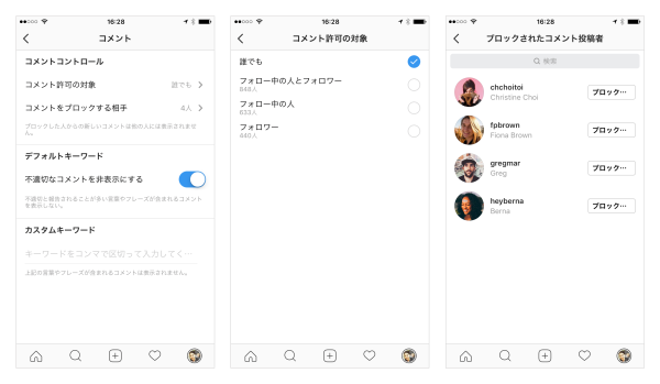 - 公開アカウントの利用者は「誰でも」「フォロー中の人とフォロワー」「フォロー中の人」「フォロワー」のいずれかを選び、自身のフィード投稿にコメントできる対象を管理できます。また、フィード投稿へのコメントをブロックするアカウントも指定できます。