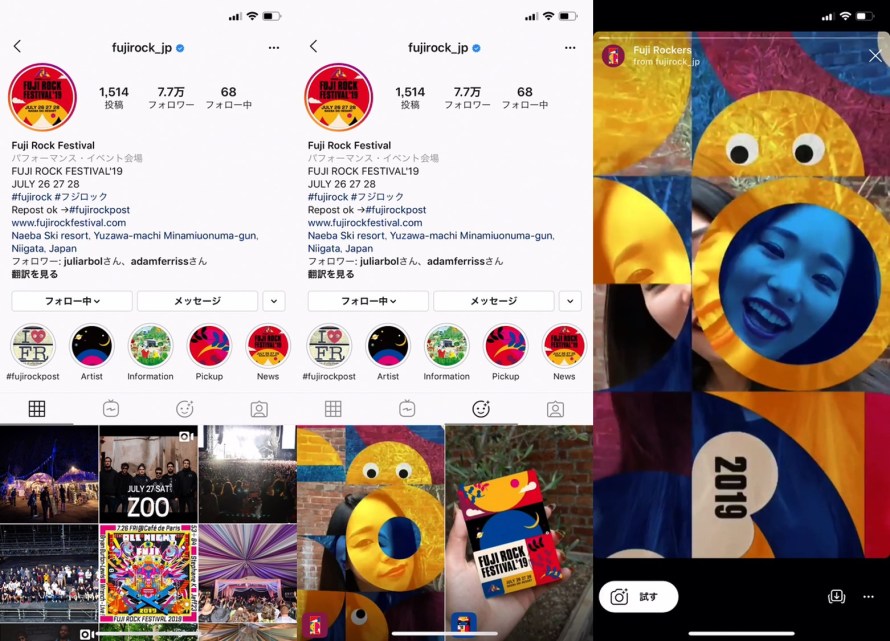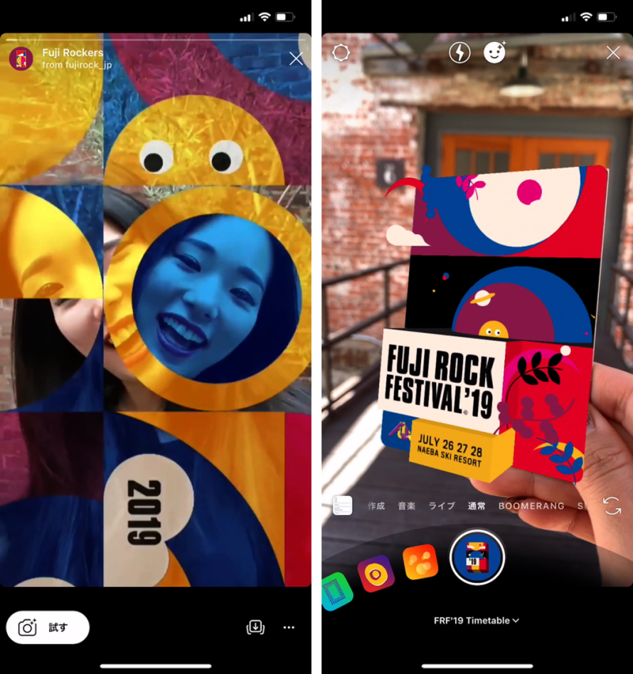 Instagramは2019年7月23日、Instagramストーリーズで使えるARカメラエフェクトに、今月26日(金)から開催されるFUJI ROCK FESTIVAL 2019(@fujirock_jp、以下 FUJI ROCK)に向けた特別デザインを追加します。