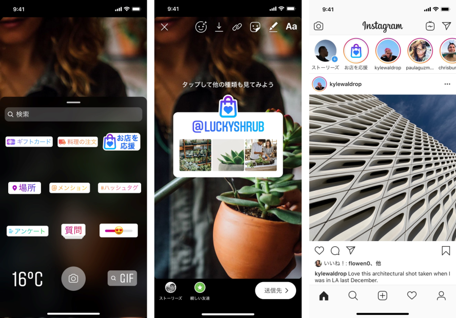 また、利用者がお気に入りのビジネスのInstagramアカウントを紹介したいときに使える「お店を応援」スタンプも本日ローンチします。