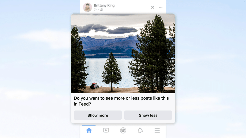 - 投稿で「表示を増やす」または「表示を減らす」を選択しFacebookフィードをカスタマイズすることで、利用者が見たいコンテンツの表示を増やし、そうではないコンテンツの表示を減らすことができます。