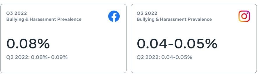 いじめや嫌がらせに関するコンテンツの事前対応率は、2022年第3四半期にはFacebook上において76.7%から67.8%に、Instagram上においては87.4%から84.3%に減少しました。これは、Metaのテクノロジーにおける精度向上(およびシステム上の不具合が修正されたこと)によるものです。