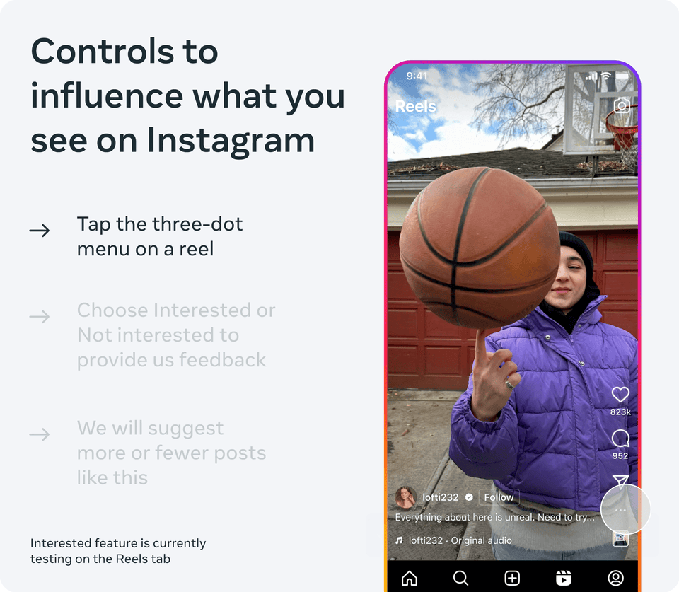 私たちのウェブサイトで公開したからといって、誰もが情報を見つけられるとは限りません。そのため私たちは、Metaのシステムがあなたに関連するコンテンツを予測した理由や、その予測につながった可能性のある活動や入力の種類についての詳細を、アプリで直接確認できるようにしています。いくつかのフィードのコンテンツや、FacebookとInstagramの全ての広告で以前から「この投稿が表示される理由」機能を提供しています。この機能を今後数週間で、Instagramのリールタブや発見タブ、Facebookリールでも提供します。個々のリールをクリックすると、あなたの以前の行動が、あなたが目にするリールを配信する機械学習モデルにどのような情報を与えた可能性があるか、詳細情報を見ることができるようになります。